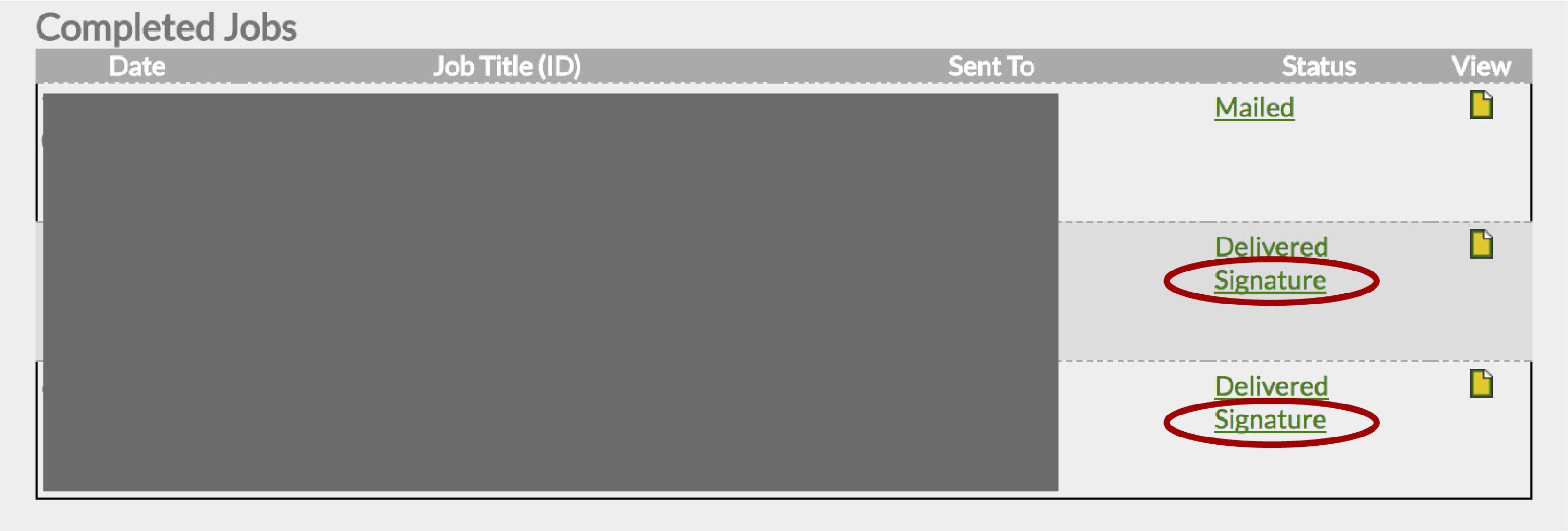 When the signature becomes available, the word "Signature" will appear below the word "Delivered" in your Job History. Simply click on the word Signature to download the signature file as shown below;