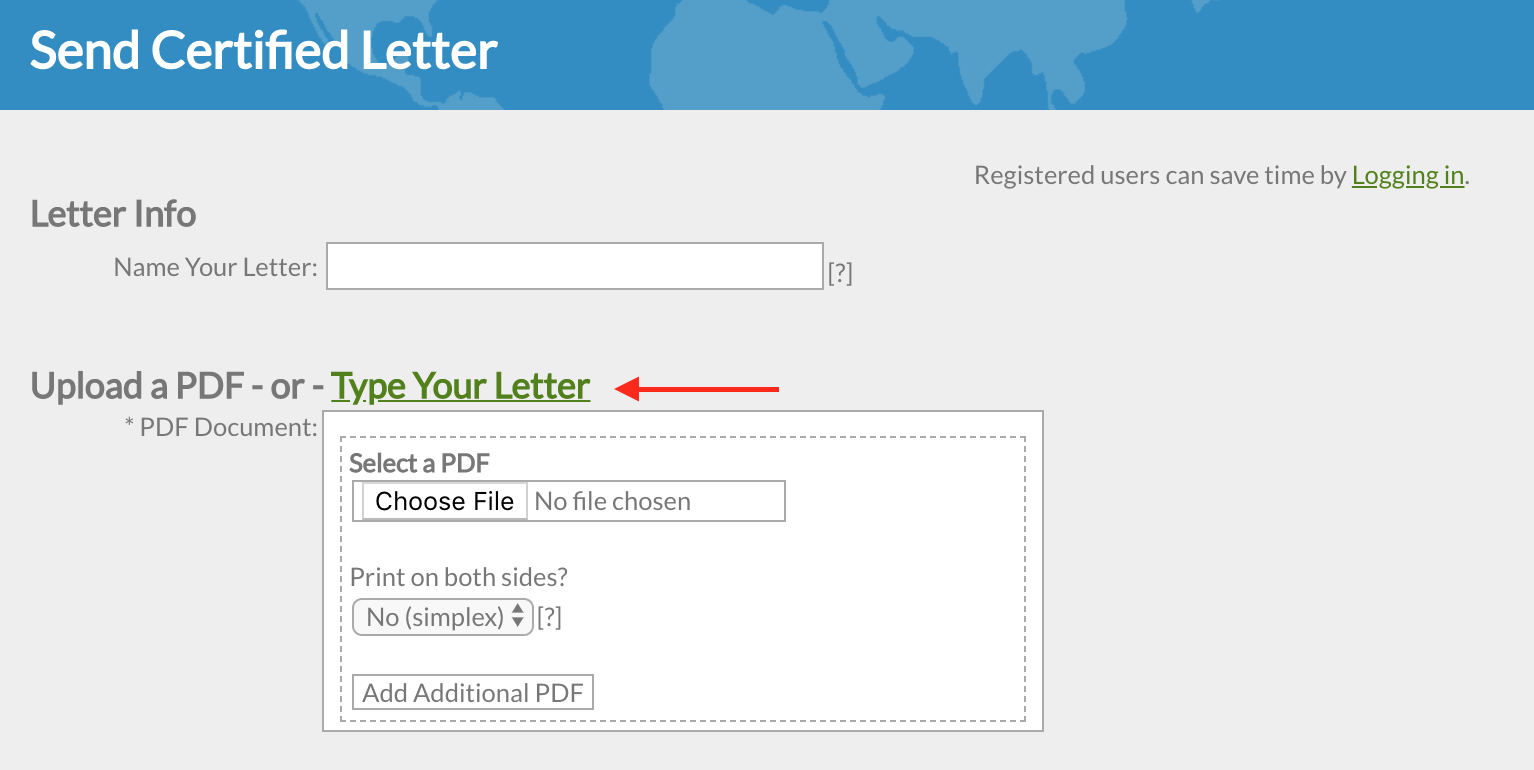 This will allow you to manually type out a letter directly on our website, as well as select from a handful of different fonts and formatting options. After you are finished typing your letter, simply scroll down and enter the sender/recipient address information and then click continue.